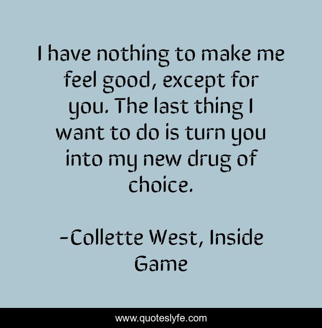 This page presents the quote "I have nothing to make me feel good, except for you. The last thing I want to do is turn you into my new drug of choice.". Author of this quote is Collette West, Inside Game. This quote is about contemporary-romance, new-york-kings, baseball-romance, collette-west, sports-romance,.