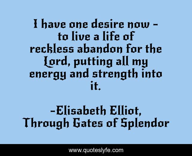 This page presents the quote "I have one desire now - to live a life of reckless abandon for the Lord, putting all my energy and strength into it.". Author of this quote is Elisabeth Elliot, Through Gates of Splendor. This quote is about faith, christianity,.