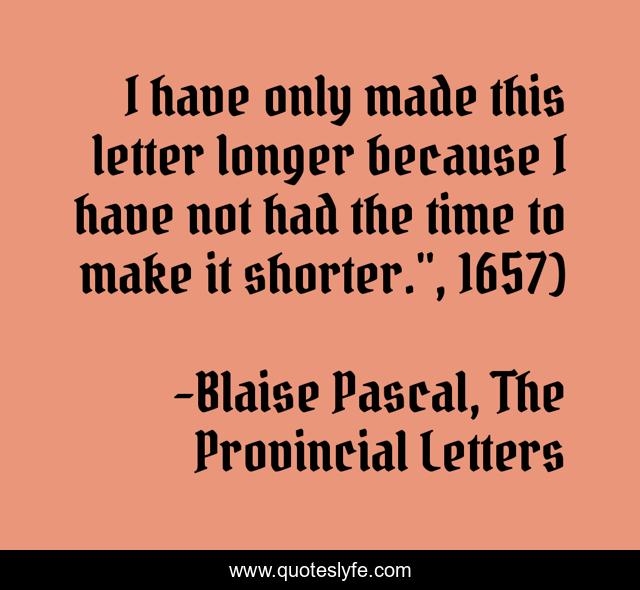 This page presents the quote "I have only made this letter longer because I have not had the time to make it shorter.", 1657)". Author of this quote is Blaise Pascal, The Provincial Letters. This quote is about correspondence, conciseness, pithy, humor, writing, wit, brevity, letters,.