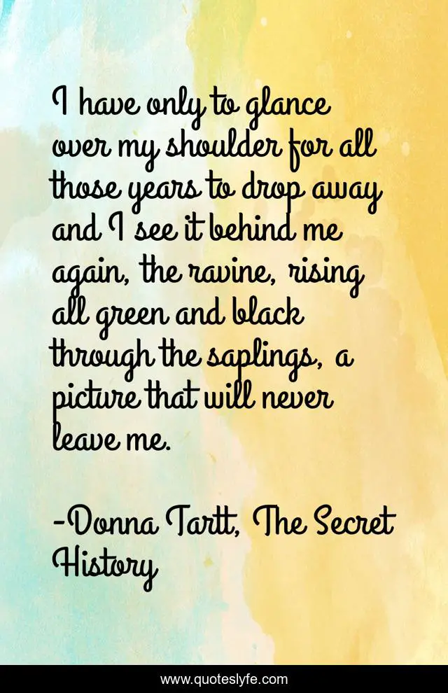 This page presents the quote "I have only to glance over my shoulder for all those years to drop away and I see it behind me again, the ravine, rising all green and black through the saplings, a picture that will never leave me.". Author of this quote is Donna Tartt, The Secret History. This quote is about donna-tartt, indelible, prologue, haunted, memory, guilt, beginning, the-secret-history,.