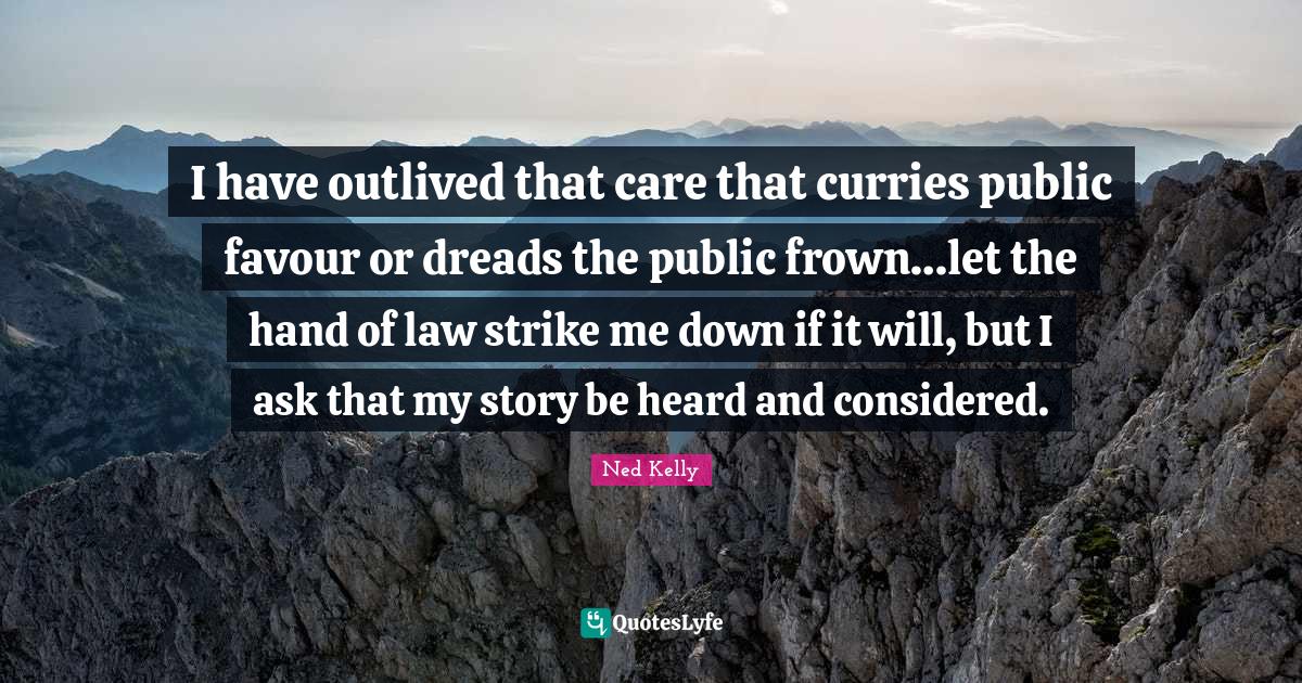 This page presents the quote "I have outlived that care that curries public favour or dreads the public frown…let the hand of law strike me down if it will, but I ask that my story be heard and considered.". Author of this quote is Ned Kelly. This quote is about favour, hands, care, heard, law, wisdom,.