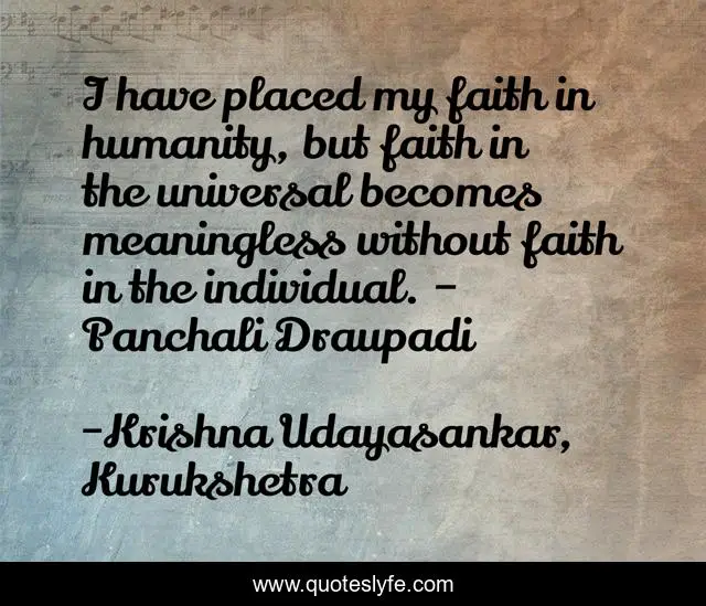 This page presents the quote "I have placed my faith in humanity, but faith in the universal becomes meaningless without faith in the individual. – Panchali Draupadi". Author of this quote is Krishna Udayasankar, Kurukshetra. This quote is about fiction, strategy, indian, mythology, war, nobility,.