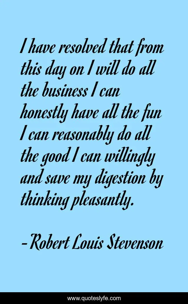 This page presents the quote "I have resolved that from this day on I will do all the business I can honestly have all the fun I can reasonably do all the good I can willingly and save my digestion by thinking pleasantly.". Author of this quote is Robert Louis Stevenson. This quote is about day, one,.