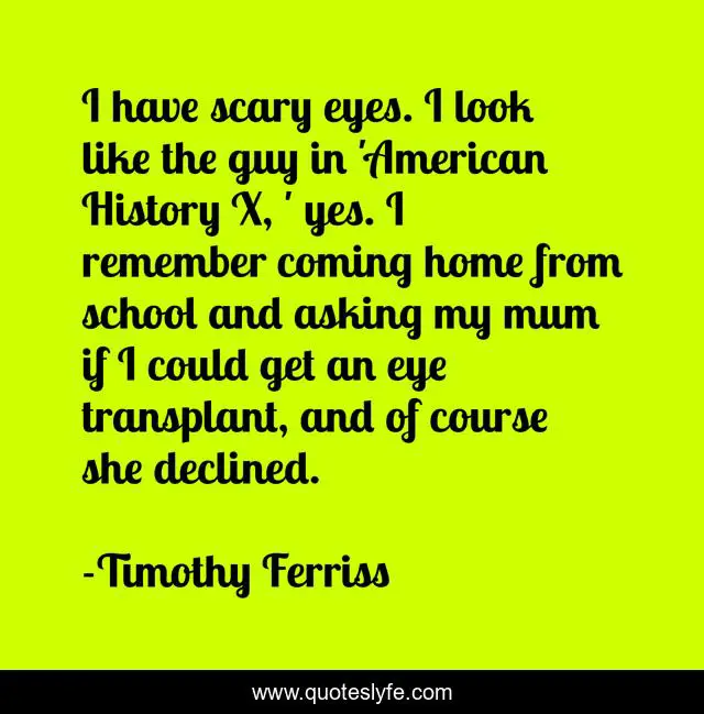 This page presents the quote "I have scary eyes. I look like the guy in 'American History X, ' yes. I remember coming home from school and asking my mum if I could get an eye transplant, and of course she declined.". Author of this quote is Timothy Ferriss. This quote is about home, eyes, school,.