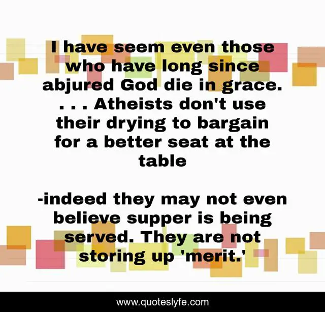 This page presents the quote "I have seem even those who have long since abjured God die in grace. . . . Atheists don't use their drying to bargain for a better seat at the table". Author of this quote is indeed they may not even believe supper is being served. They are not storing up 'merit.'. .