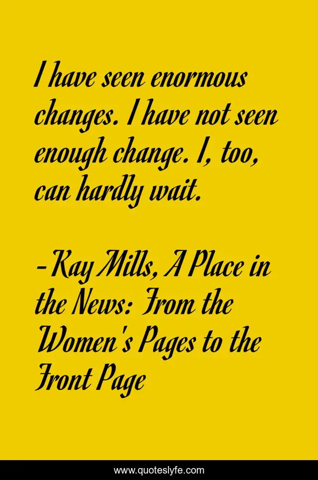 This page presents the quote "I have seen enormous changes. I have not seen enough change. I, too, can hardly wait.". Author of this quote is Kay Mills, A Place in the News: From the Women's Pages to the Front Page. This quote is about journalism, feminism, women,.