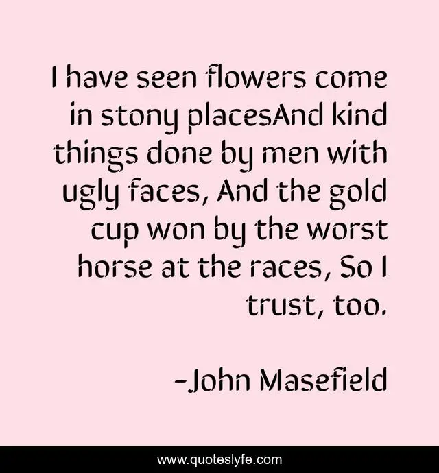 This page presents the quote "I have seen flowers come in stony placesAnd kind things done by men with ugly faces, And the gold cup won by the worst horse at the races, So I trust, too.". Author of this quote is John Masefield. This quote is about kindness, trust, people, wisdom, winners, losers, decency, flowers, worth,.