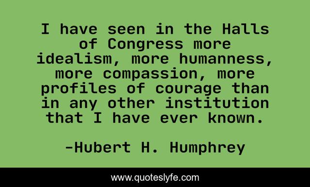This page presents the quote "I have seen in the Halls of Congress more idealism, more humanness, more compassion, more profiles of courage than in any other institution that I have ever known.". Author of this quote is Hubert H. Humphrey. This quote is about compassion, congress,.