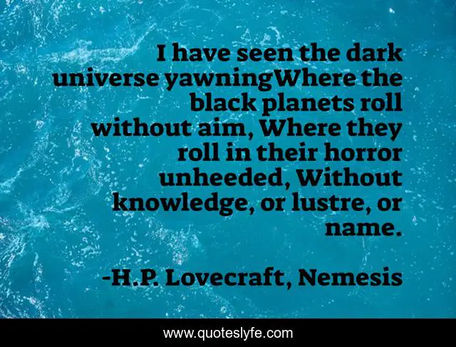 This page presents the quote "I have seen the dark universe yawningWhere the black planets roll without aim, Where they roll in their horror unheeded, Without knowledge, or lustre, or name.". Author of this quote is H.P. Lovecraft, Nemesis. This quote is about dark-universe, horror,.