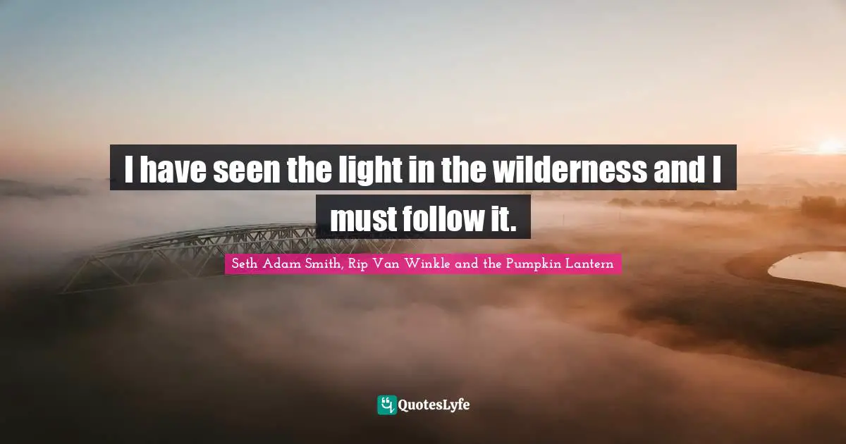 This page presents the quote "I have seen the light in the wilderness and I must follow it.". Author of this quote is Seth Adam Smith, Rip Van Winkle and the Pumpkin Lantern. This quote is about faith, moving-forward, wilderness, perseverance, light, seth-adam-smith, truth, forward, follow,.