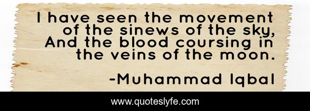 This page presents the quote "I have seen the movement of the sinews of the sky, And the blood coursing in the veins of the moon.". Author of this quote is Muhammad Iqbal. This quote is about sky, blood, moon,.