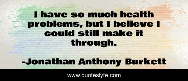 This page presents the quote "I have so much health problems, but I believe I could still make it through.". Author of this quote is Jonathan Anthony Burkett. This quote is about new-year, life, self-determination, one-life-dont-stop-living-it, jonathan-burkett, believe-and-achieve, one-life, forgiveness, believe-in-yourself,.