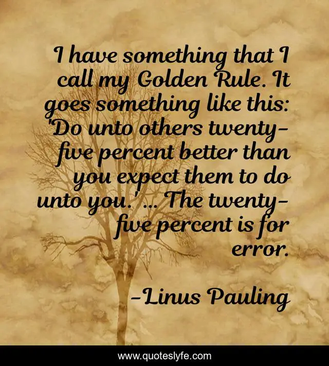 This page presents the quote "I have something that I call my Golden Rule. It goes something like this: 'Do unto others twenty-five percent better than you expect them to do unto you.' … The twenty-five percent is for error.". Author of this quote is Linus Pauling. This quote is about humor, science, inspirational, enthusiasm, ethical-code, golden-rule, ethics, paraphrased,.