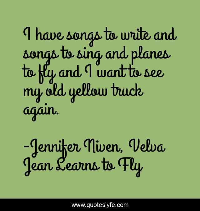 This page presents the quote "I have songs to write and songs to sing and planes to fly and I want to see my old yellow truck again.". Author of this quote is Jennifer Niven, Velva Jean Learns to Fly. .