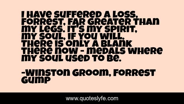 This page presents the quote "I have suffered a loss, Forrest, far greater than my legs. It's my spirit, my soul, if you will. There is only a blank there now - medals where my soul used to be.". Author of this quote is Winston Groom, Forrest Gump. This quote is about loss, disillusionment, soul, spirit, broken, truth, sad-but-true, medal, war,.