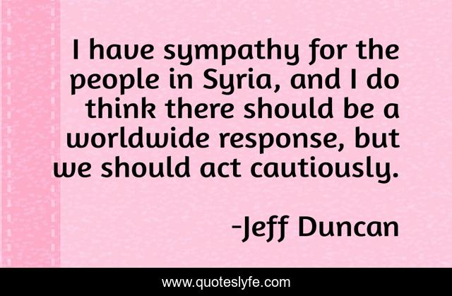 This page presents the quote "I have sympathy for the people in Syria, and I do think there should be a worldwide response, but we should act cautiously.". Author of this quote is Jeff Duncan. This quote is about people, response, think,.
