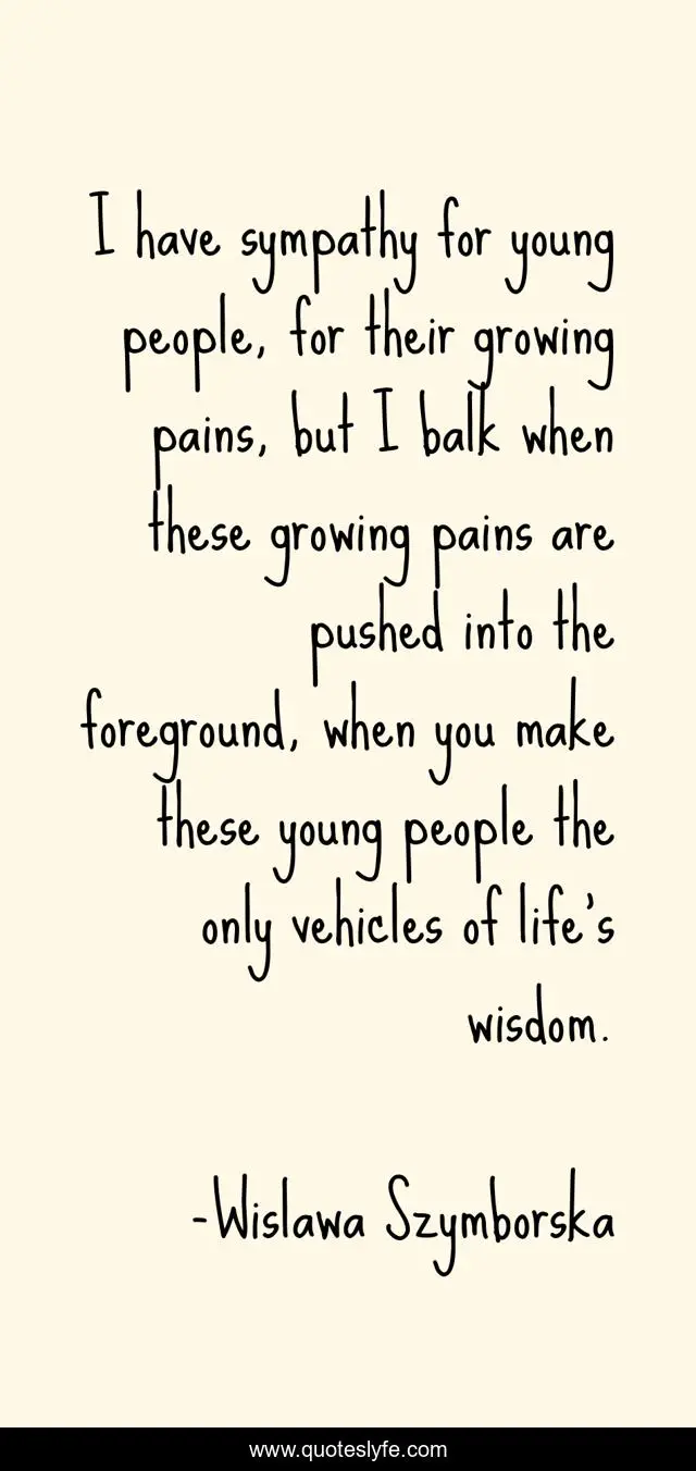 This page presents the quote "I have sympathy for young people, for their growing pains, but I balk when these growing pains are pushed into the foreground, when you make these young people the only vehicles of life's wisdom.". Author of this quote is Wislawa Szymborska. This quote is about life, wisdom, people,.