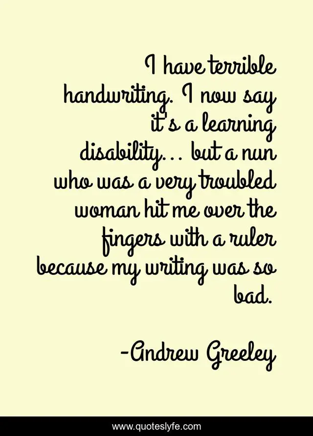 This page presents the quote "I have terrible handwriting. I now say it's a learning disability... but a nun who was a very troubled woman hit me over the fingers with a ruler because my writing was so bad.". Author of this quote is Andrew Greeley. This quote is about woman, disability, writing,.