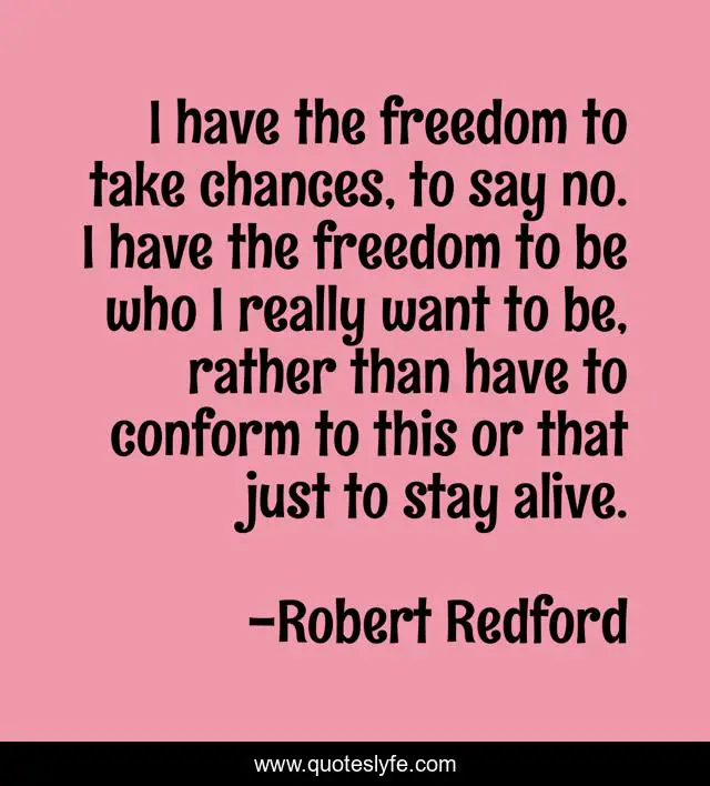 This page presents the quote "I have the freedom to take chances, to say no. I have the freedom to be who I really want to be, rather than have to conform to this or that just to stay alive.". Author of this quote is Robert Redford. .