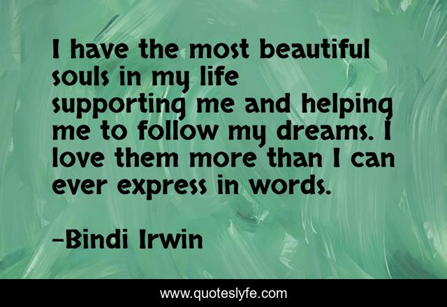 This page presents the quote "I have the most beautiful souls in my life supporting me and helping me to follow my dreams. I love them more than I can ever express in words.". Author of this quote is Bindi Irwin. This quote is about beautiful, life, love, affection,.