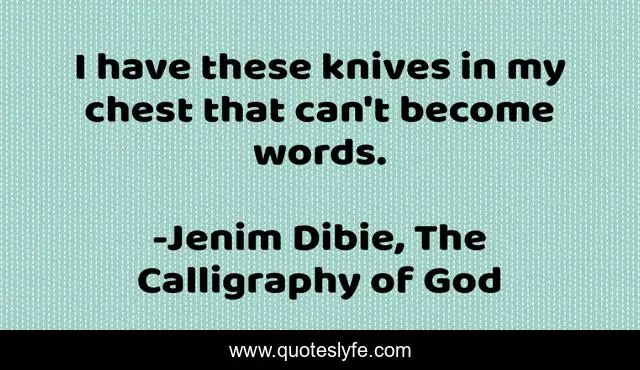 "Jenim Dibie, The Calligraphy of God Quotes." Quoteslyfe.com, 2025. Fri. 05 Dec. 2025. <https://www.quoteslyfe.com/quote/I-have-these-knives-in-my-chest-76195>.