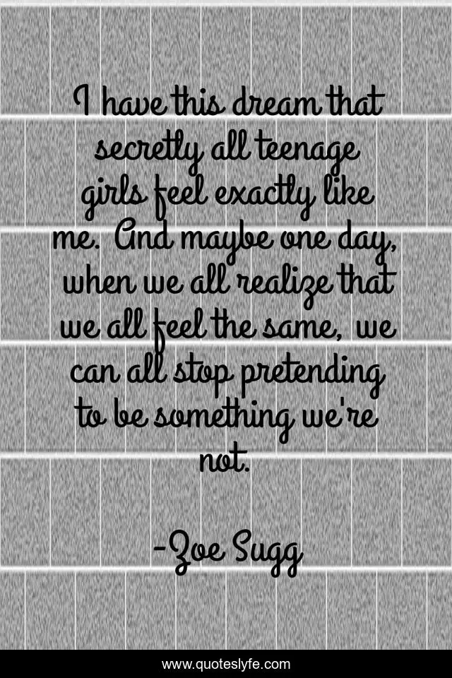 This page presents the quote "I have this dream that secretly all teenage girls feel exactly like me. And maybe one day, when we all realize that we all feel the same, we can all stop pretending to be something we're not.". Author of this quote is Zoe Sugg. This quote is about teenage, girls, girl-online, teenagers,.
