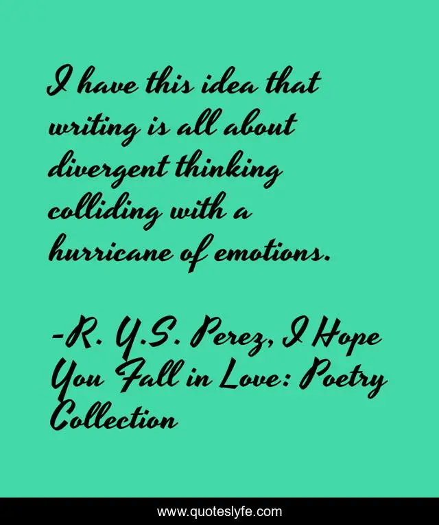 This page presents the quote "I have this idea that writing is all about divergent thinking colliding with a hurricane of emotions.". Author of this quote is R. Y.S. Perez, I Hope You Fall in Love: Poetry Collection. This quote is about introduction, writing-craft, writing,.