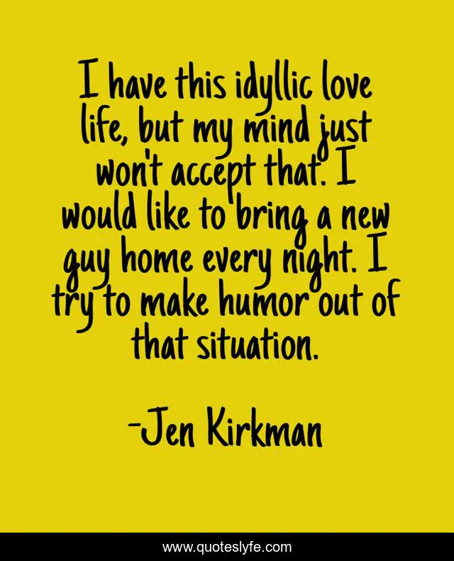 This page presents the quote "I have this idyllic love life, but my mind just won't accept that. I would like to bring a new guy home every night. I try to make humor out of that situation.". Author of this quote is Jen Kirkman. This quote is about home, life, love, affection,.