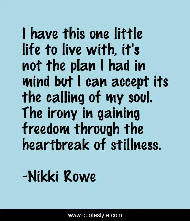 This page presents the quote "I have this one little life to live with, it's not the plan I had in mind but I can accept its the calling of my soul. The irony in gaining freedom through the heartbreak of stillness.". Author of this quote is Nikki Rowe. This quote is about faith, courage, illness, inspire, keep-fighting, illness-and-hope, crps, believe, strength,.