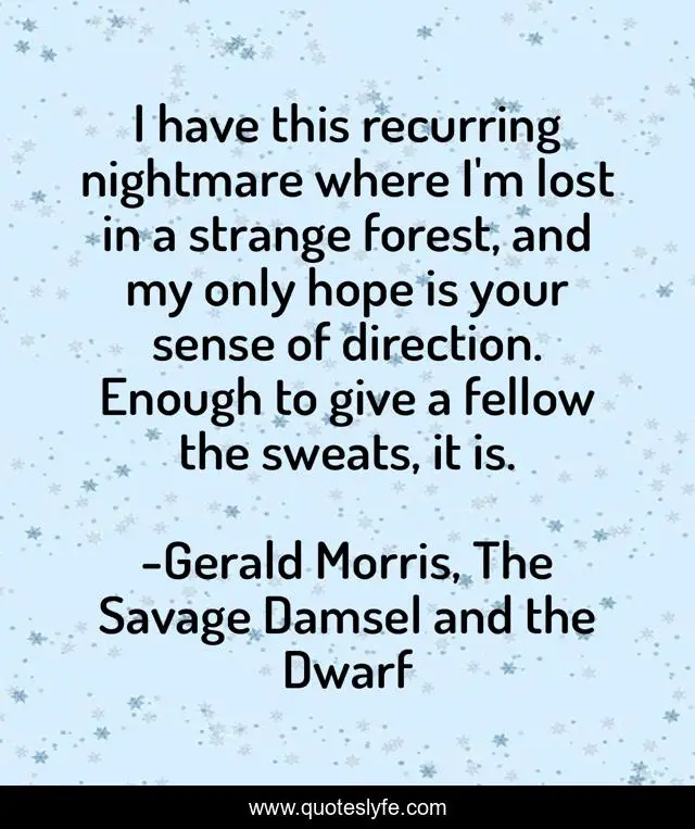 This page presents the quote "I have this recurring nightmare where I'm lost in a strange forest, and my only hope is your sense of direction. Enough to give a fellow the sweats, it is.". Author of this quote is Gerald Morris, The Savage Damsel and the Dwarf. This quote is about direction, nightmare, lost,.