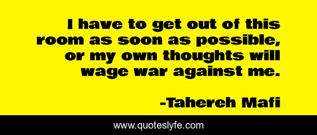This page presents the quote "I have to get out of this room as soon as possible, or my own thoughts will wage war against me.". Author of this quote is Tahereh Mafi. This quote is about destroy-me, shatter-me, war, thoughts, warner,.
