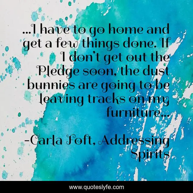 This page presents the quote "...I have to go home and get a few things done. If I don’t get out the Pledge soon, the dust bunnies are going to be leaving tracks on my furniture...". Author of this quote is Carla Foft, Addressing Spirits. This quote is about work, cleaning, humour,.