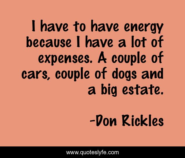 This page presents the quote "I have to have energy because I have a lot of expenses. A couple of cars, couple of dogs and a big estate.". Author of this quote is Don Rickles. This quote is about energy, dogs, expenses,.