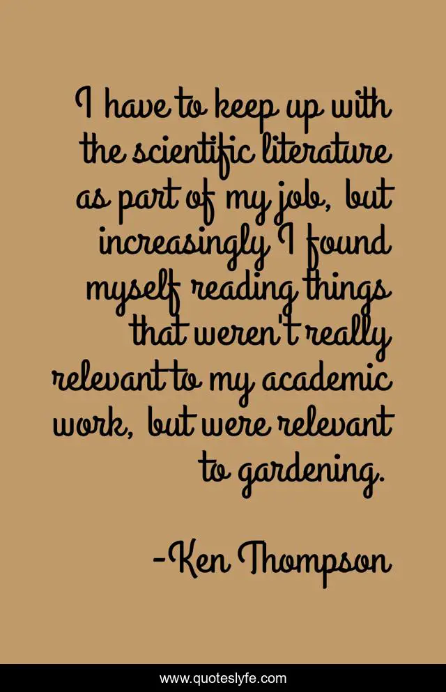 This page presents the quote "I have to keep up with the scientific literature as part of my job, but increasingly I found myself reading things that weren't really relevant to my academic work, but were relevant to gardening.". Author of this quote is Ken Thompson. This quote is about myself, work, job,.