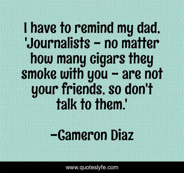 This page presents the quote "I have to remind my dad, 'Journalists - no matter how many cigars they smoke with you - are not your friends, so don't talk to them.'". Author of this quote is Cameron Diaz. This quote is about matter, friends,.