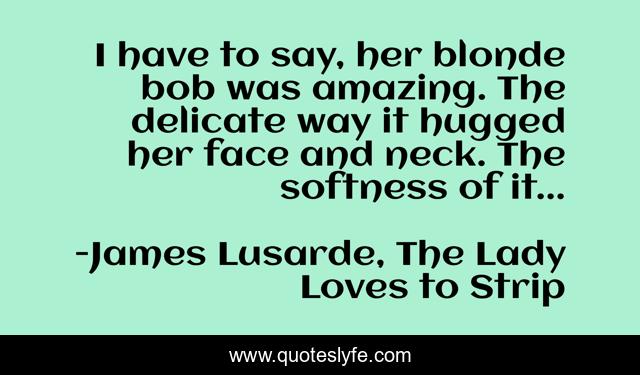 This page presents the quote "I have to say, her blonde bob was amazing. The delicate way it hugged her face and neck. The softness of it...". Author of this quote is James Lusarde, The Lady Loves to Strip. This quote is about relationships, erotic-romance, love, beauty, romance, attraction, infatuation, men-and-women, erotica-romance,.