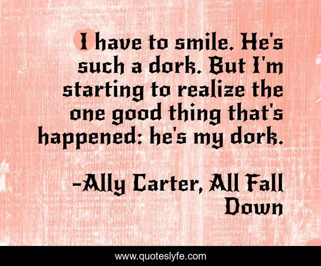 This page presents the quote "I have to smile. He's such a dork. But I'm starting to realize the one good thing that's happened: he's my dork.". Author of this quote is Ally Carter, All Fall Down. This quote is about unexpected, noah, friendship, dork, smile, good-things, grace, happiness,.