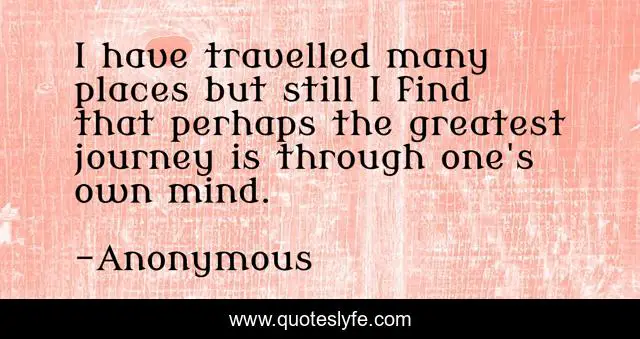 This page presents the quote "I have travelled many places but still I find that perhaps the greatest journey is through one's own mind.". Author of this quote is Anonymous. This quote is about self, enlightenment, journey,.