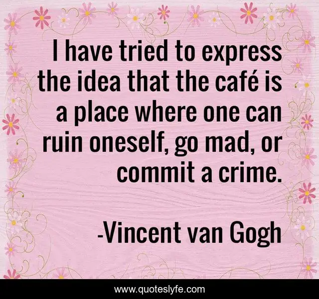 This page presents the quote "I have tried to express the idea that the café is a place where one can ruin oneself, go mad, or commit a crime.". Author of this quote is Vincent van Gogh. This quote is about painting, meaning, the-night-cafe,.