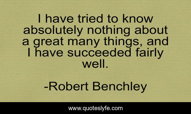 This page presents the quote "I have tried to know absolutely nothing about a great many things, and I have succeeded fairly well.". Author of this quote is Robert Benchley. This quote is about nothing, great,.