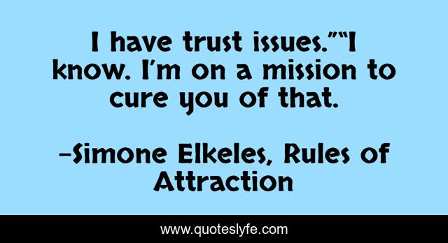 This page presents the quote "I have trust issues.”“I know. I’m on a mission to cure you of that.". Author of this quote is Simone Elkeles, Rules of Attraction. This quote is about romance, young-adult-fiction, young-adult-romance,.