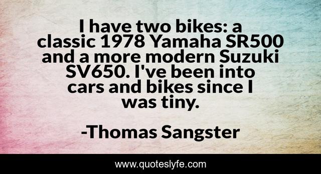 This page presents the quote "I have two bikes: a classic 1978 Yamaha SR500 and a more modern Suzuki SV650. I've been into cars and bikes since I was tiny.". Author of this quote is Thomas Sangster. This quote is about modern, two, classic,.
