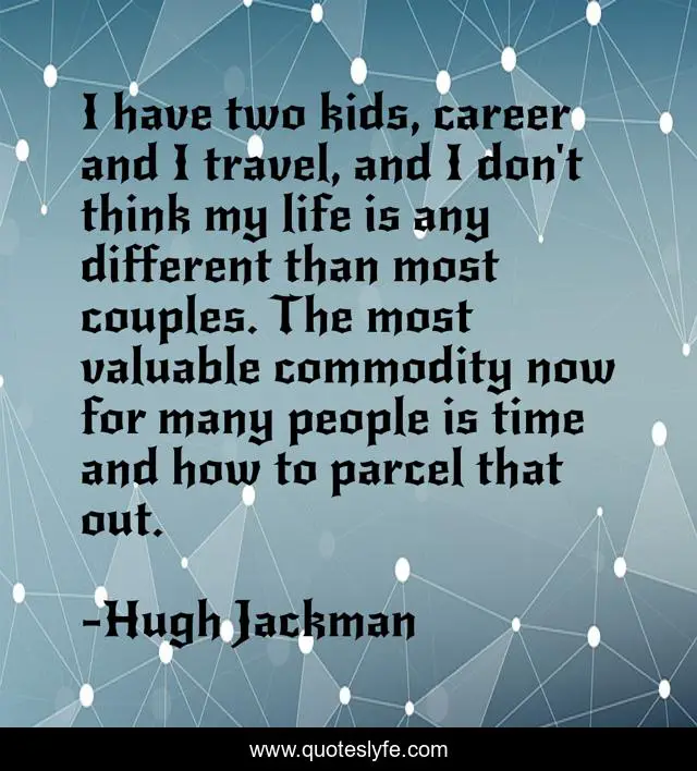 This page presents the quote "I have two kids, career and I travel, and I don't think my life is any different than most couples. The most valuable commodity now for many people is time and how to parcel that out.". Author of this quote is Hugh Jackman. This quote is about life, time, people,.