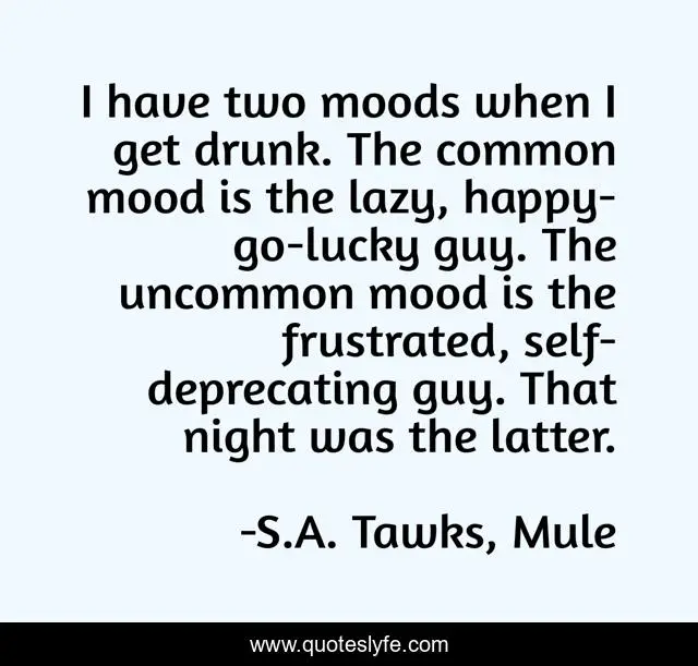 This page presents the quote "I have two moods when I get drunk. The common mood is the lazy, happy-go-lucky guy. The uncommon mood is the frustrated, self-deprecating guy. That night was the latter.". Author of this quote is S.A. Tawks, Mule. This quote is about drugs, travel, indonesia, mood, bali,.