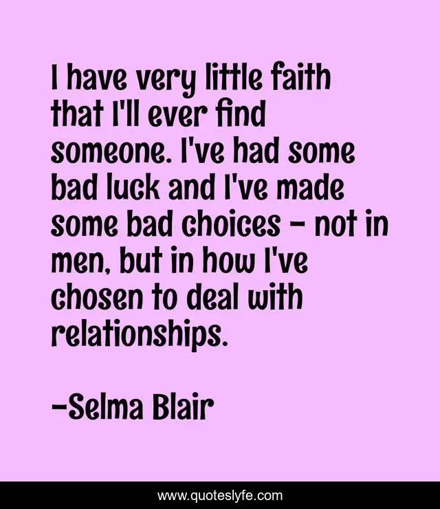 This page presents the quote "I have very little faith that I'll ever find someone. I've had some bad luck and I've made some bad choices - not in men, but in how I've chosen to deal with relationships.". Author of this quote is Selma Blair. This quote is about luck, men, choices,.