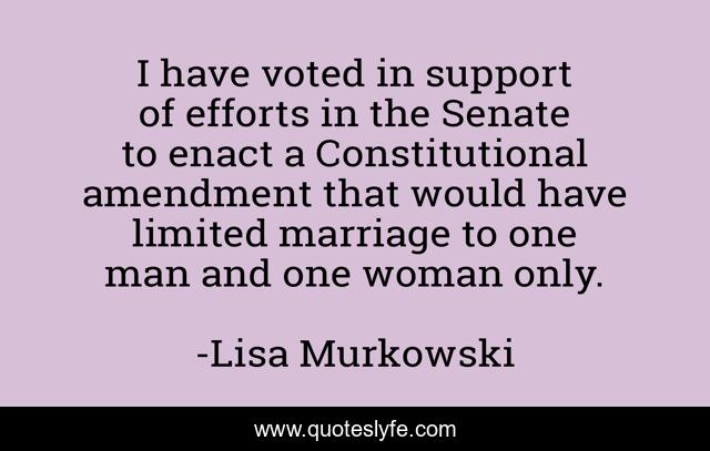 This page presents the quote "I have voted in support of efforts in the Senate to enact a Constitutional amendment that would have limited marriage to one man and one woman only.". Author of this quote is Lisa Murkowski. This quote is about support, woman, man,.
