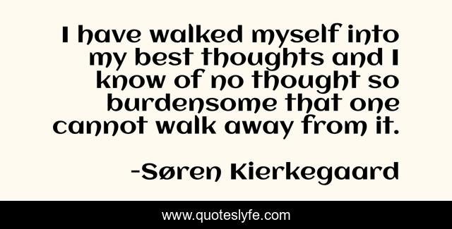This page presents the quote "I have walked myself into my best thoughts and I know of no thought so burdensome that one cannot walk away from it.". Author of this quote is Søren Kierkegaard. This quote is about walking, thoughts,.
