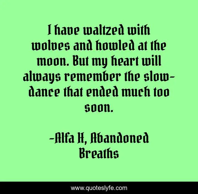 "Alfa H, Abandoned Breaths Quotes." Quoteslyfe.com, 2025. Sat. 06 Dec. 2025. <https://www.quoteslyfe.com/quote/I-have-waltzed-with-wolves-and-howled-35337>.
