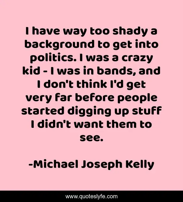 This page presents the quote "I have way too shady a background to get into politics. I was a crazy kid - I was in bands, and I don't think I'd get very far before people started digging up stuff I didn't want them to see.". Author of this quote is Michael Joseph Kelly. This quote is about crazy, people,.