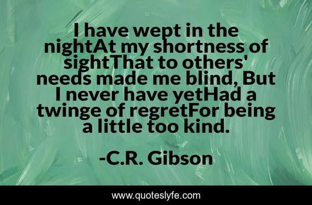 This page presents the quote "I have wept in the nightAt my shortness of sightThat to others' needs made me blind, But I never have yetHad a twinge of regretFor being a little too kind.". Author of this quote is C.R. Gibson. .